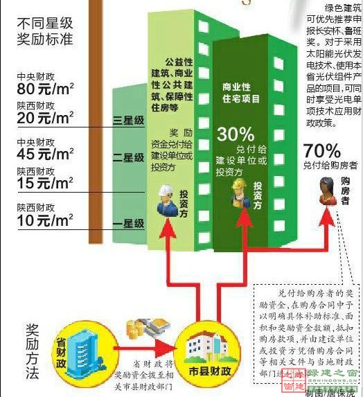 陕西对新建建筑全面推行绿色建筑标准,二星级及以上绿色建筑达到30%以上,2年内绿色建筑开工建设规模不少于200万平方米的绿色生态城区,中央财政审核给予5000万元基准的资金补助;二星级及以上绿色建筑达到30%以上,2年内绿色建筑开工建设规模介于100-200万平方米之间的绿色生态城区,除享受国家、省单体建筑奖励政策外,省财政给予每个绿色生态城区100万元资金奖励。今年中央财政奖励标准为:二星级绿色建筑45元/平方米,三星级绿色建筑80元/平方米。陕西省财政对一、二、三星级绿色建筑的奖励标准,分别为每平方米10元、15元、20元。