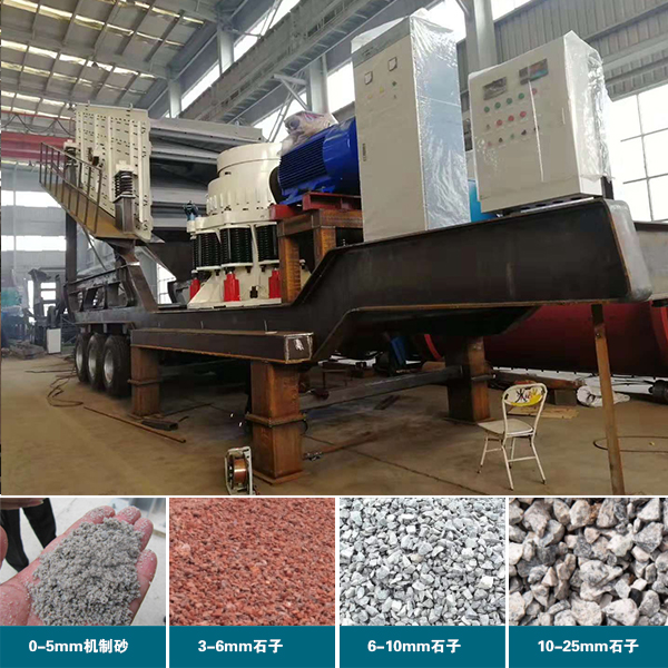 轮胎移动圆锥破碎机所有部件机载,包括:牢固的机架、圆锥式破碎机、给料机、振动筛、传送带、电动机和控制箱等。
